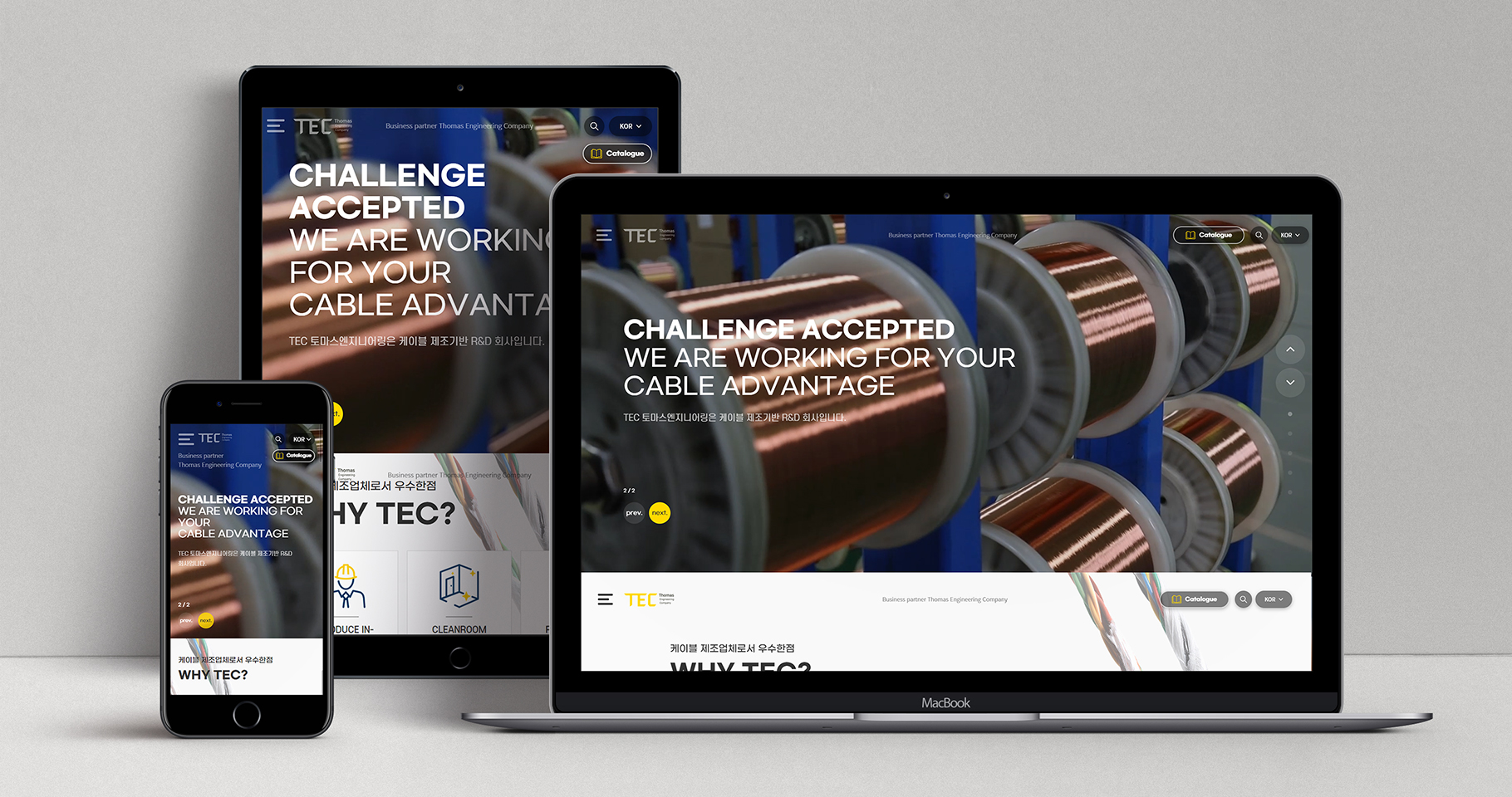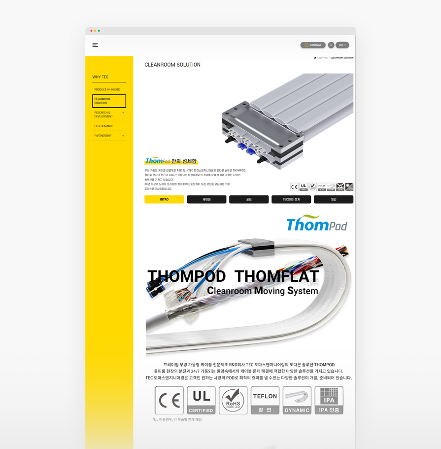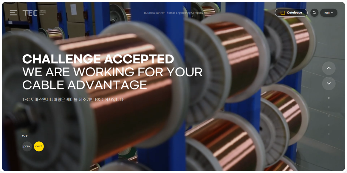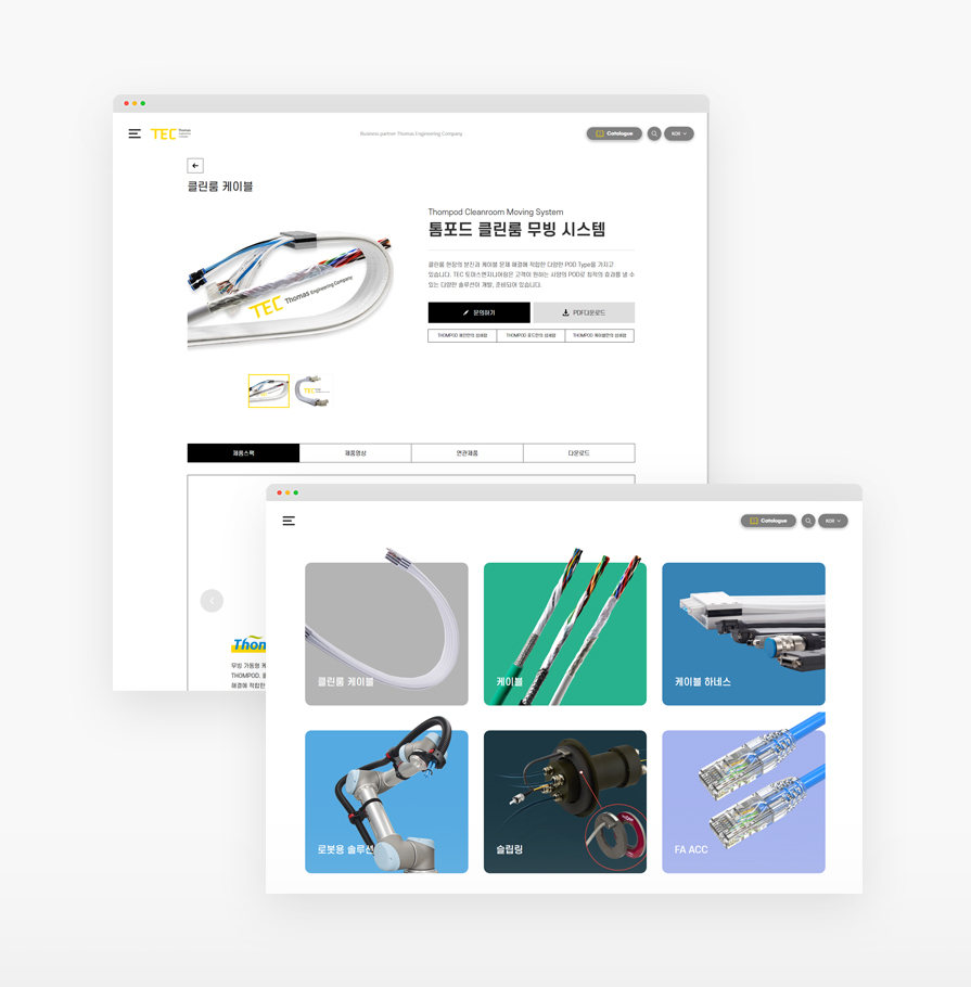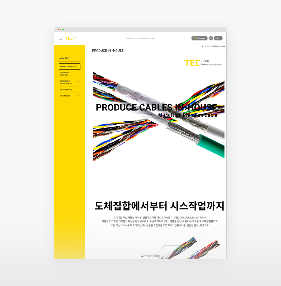 토마스엔지니어링은 케이블 제조와 하네스로 케이블 관련 토탈 솔루션을 제공하는 케이블 제조기반 R&D 회사입니다. 역동적인 화면과 케이블 특유의 비비드 컬러를 과감하게 사용하여 신선함을 살렸고 CI 컬러를 통해 전체적인 톤앤매너를 맞추었습니다. 또한 상세한 제품필터를 통해 사이트 이용자에게 높은 편의성을 제공하였습니다.