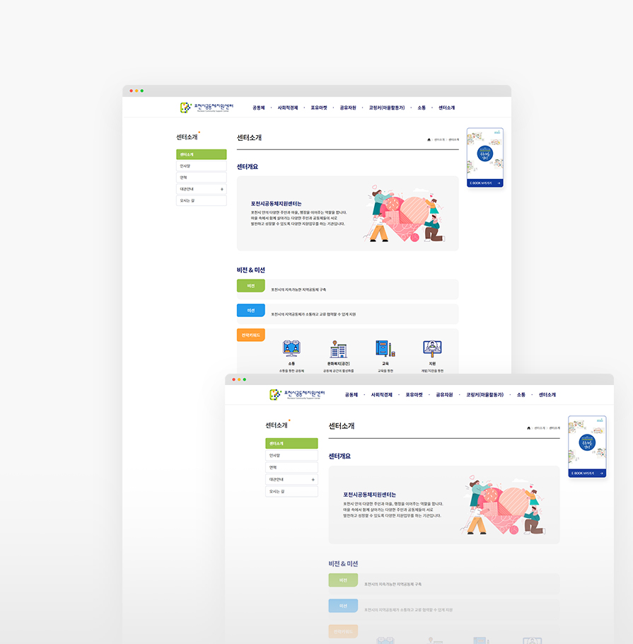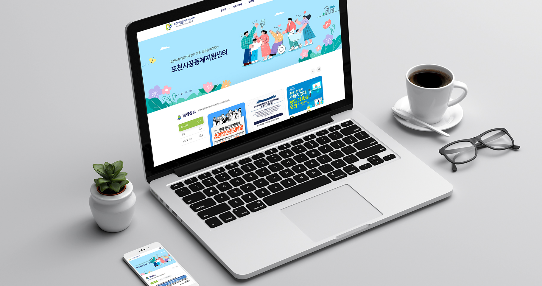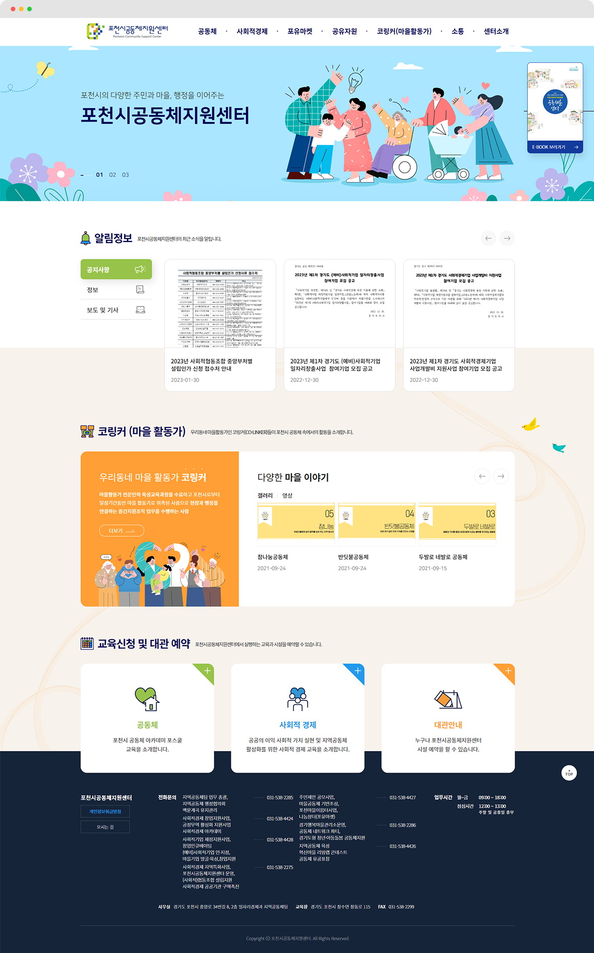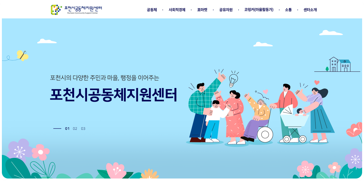 포천시공동체지원센터는 포천시 내의 지속가능한 지역공동체 구축을 위해 다양한 지원업무를 하는 기관으로, 다정하고 따뜻한 이미지를 위해 곡선위주의 일러스트와 부드러운 색감을 사용하여 디자인하였습니다. 또한 메인에 알림정보 게시판과 대관페이지 바로가기 버튼을 두어 이용자들이 다양한 정보에 쉽고 빠르게 접근할 수 있도록 구성했습니다.