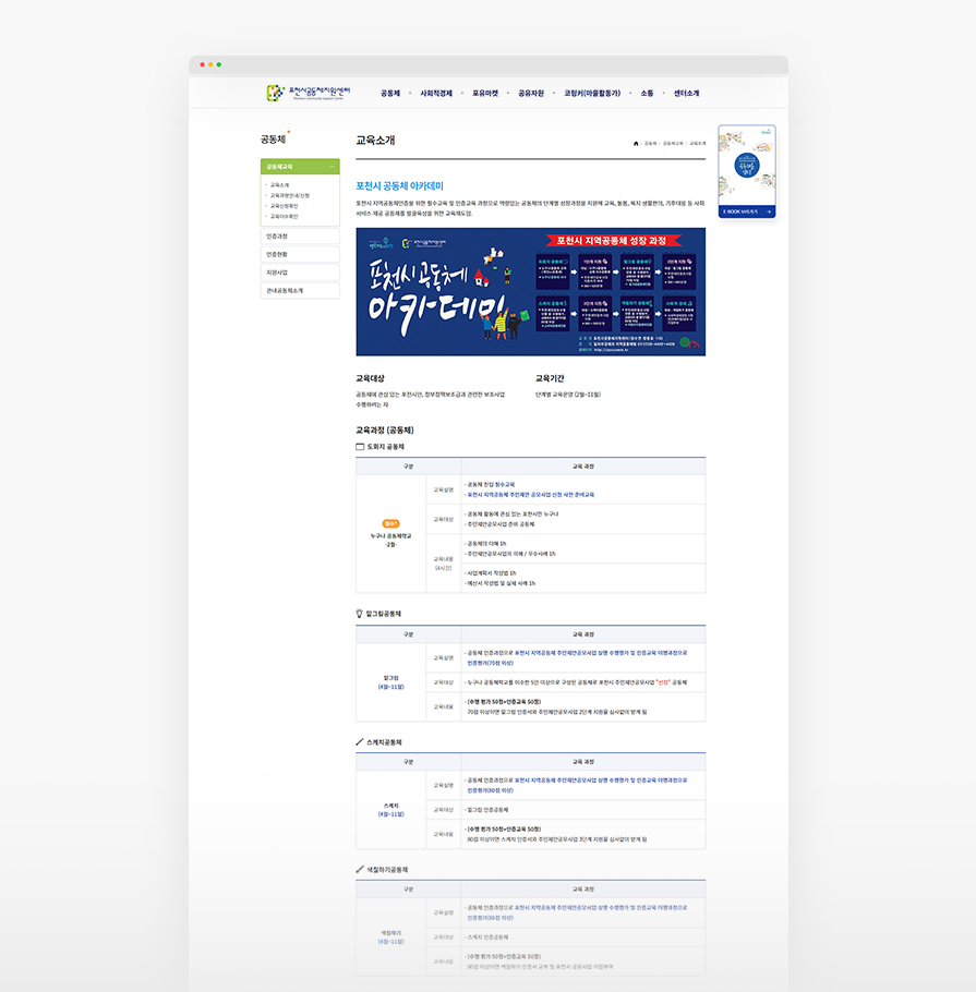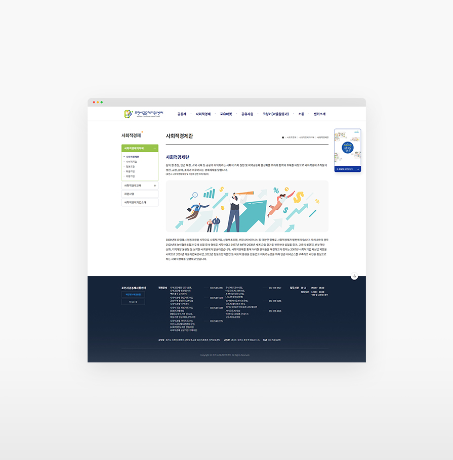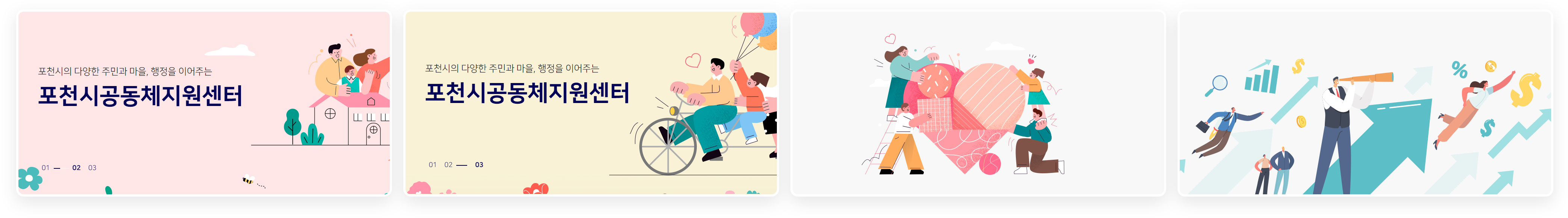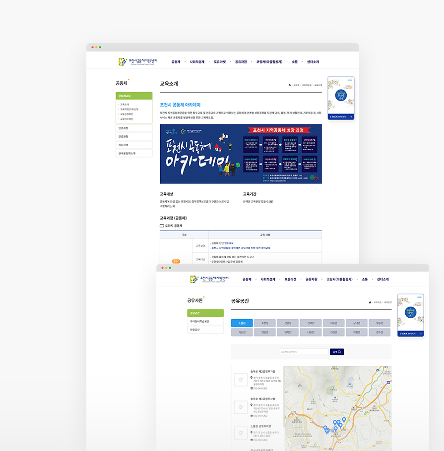 포천시공동체지원센터는 포천시 내의 지속가능한 지역공동체 구축을 위해 다양한 지원업무를 하는 기관으로, 다정하고 따뜻한 이미지를 위해 곡선위주의 일러스트와 부드러운 색감을 사용하여 디자인하였습니다. 또한 메인에 알림정보 게시판과 대관페이지 바로가기 버튼을 두어 이용자들이 다양한 정보에 쉽고 빠르게 접근할 수 있도록 구성했습니다.