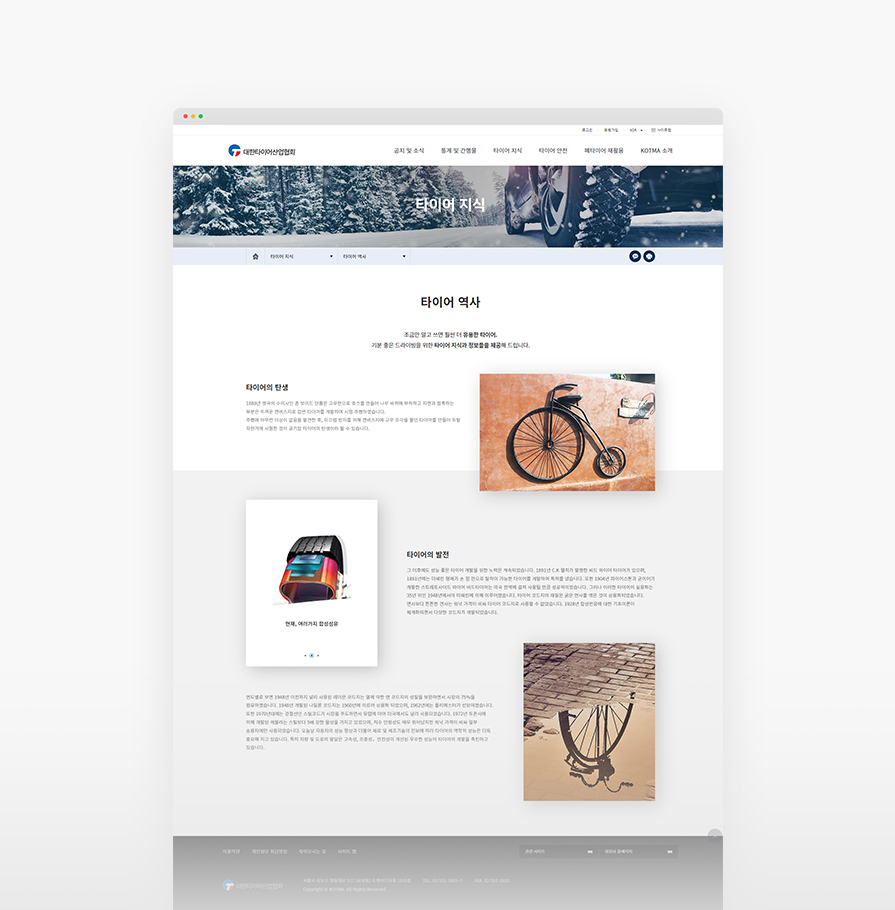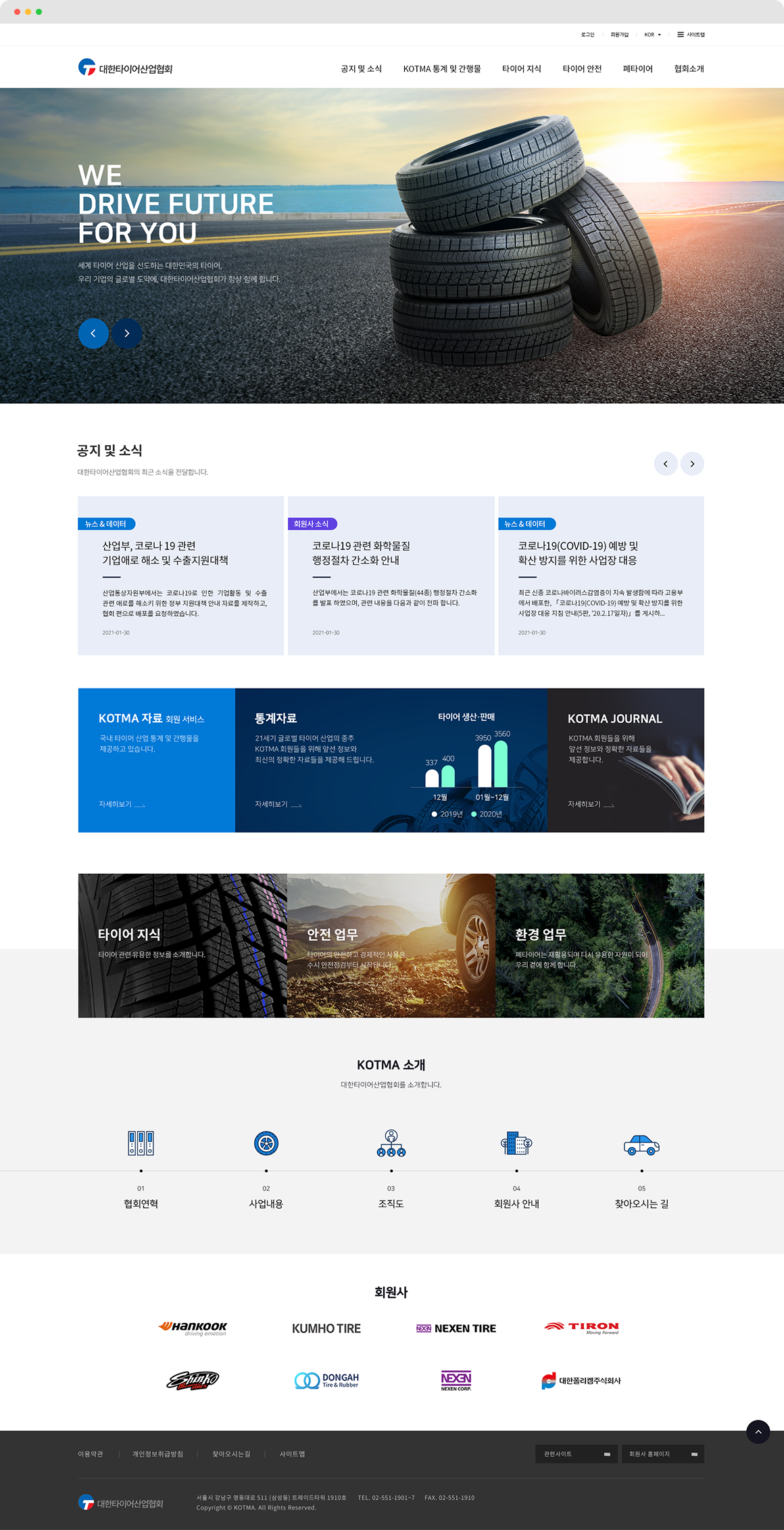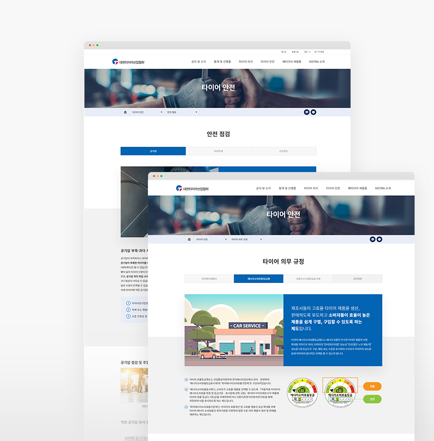대한타이어산업협회는 타이어산업의 진흥과 회원의 복리증진을 도모하기 위한 협회입니다. 회원과 일반 사이트 이용자가 확인 할 수 있는 페이지를 구분하여 원하는 정보만 선정해 공개할 수 있도록 사이트를 개발하였으며 메인페이지는 격자형 구조로 많은 콘텐츠를 효율적으로 전달할 수 있게 구성하였습니다.