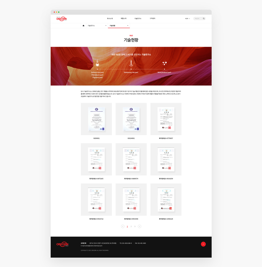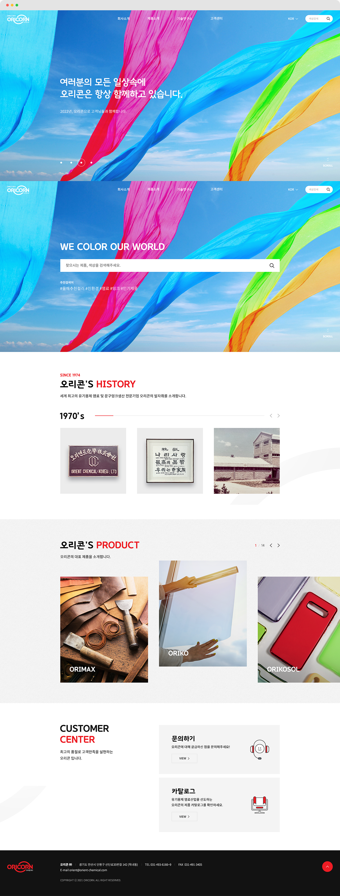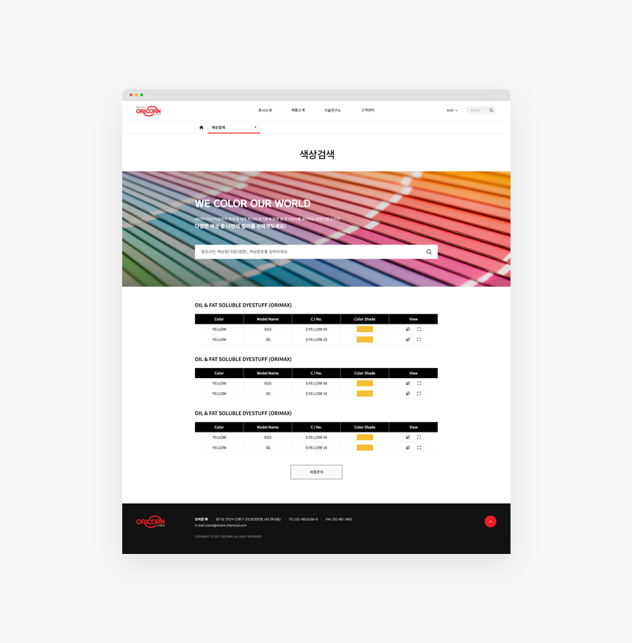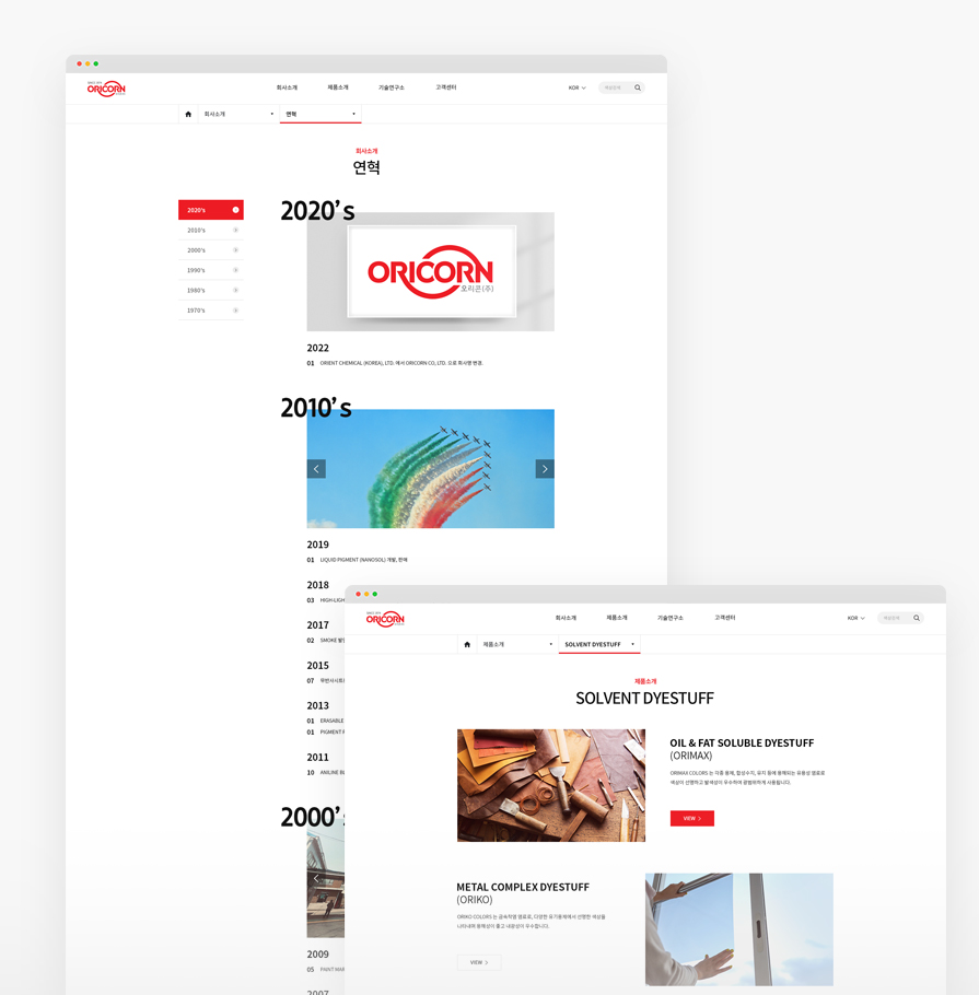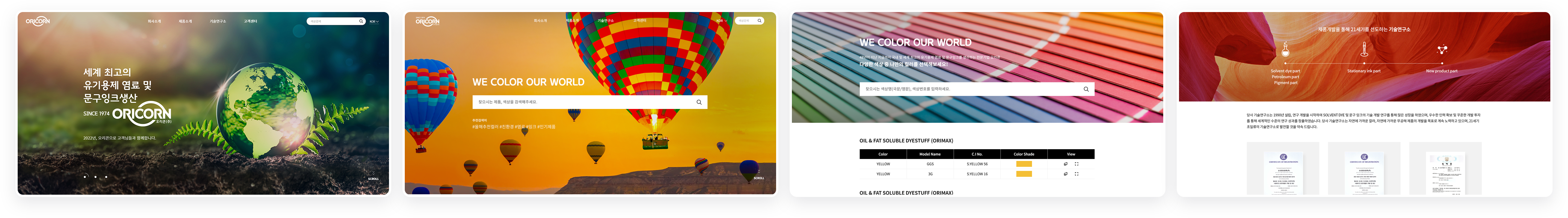 오리콘은 국내및 세계 최고의 유기용제 염료와 문구잉크를 생산하는 전문기업입니다. 새롭게 도약을 시도하는 오리콘의 홈페이지를 리뉴얼하여 고객에게 보다 편리한 UI를 제공합니다. 다양한 컬러를 표현하는 고화질의 풀이미지를 통해 오리콘의 브랜드 아이덴티티를 간접적으로 전달합니다.