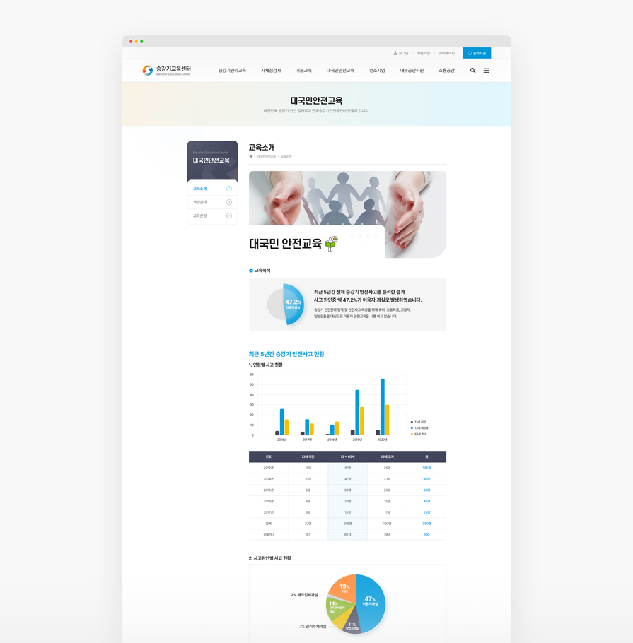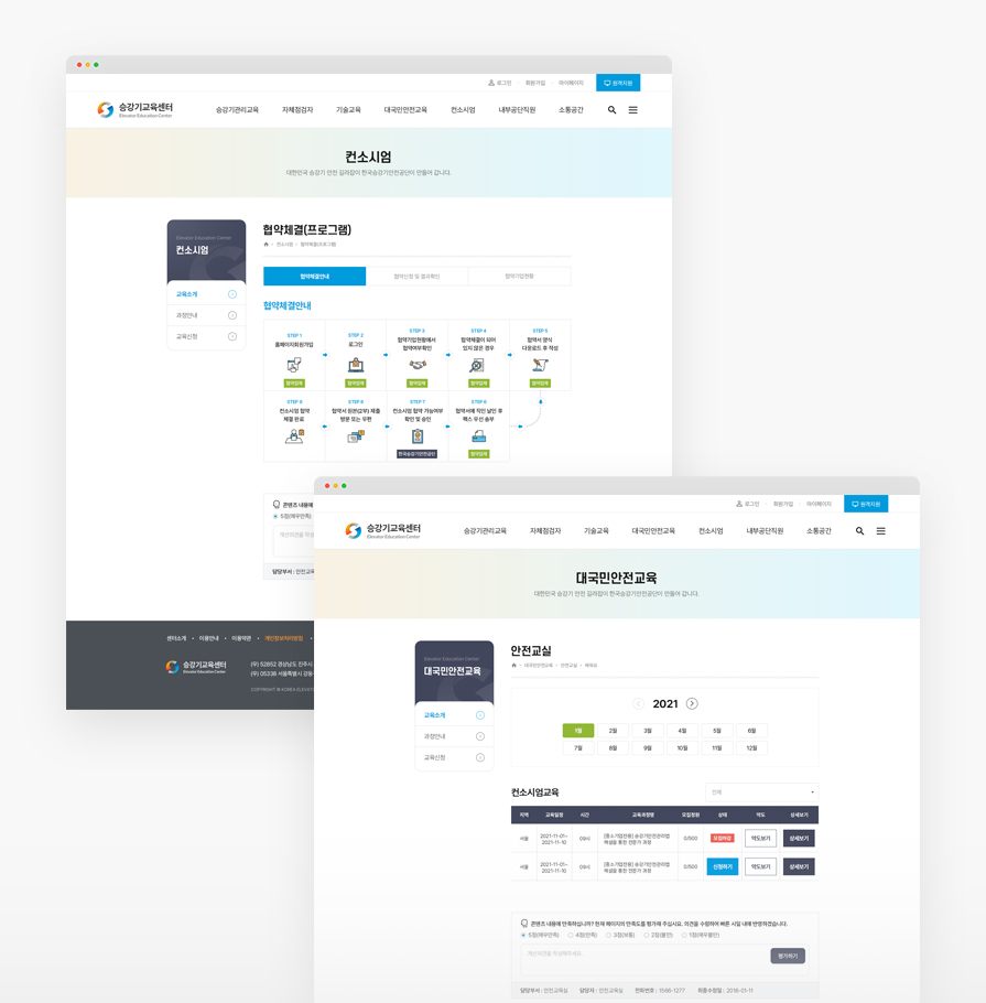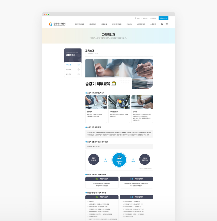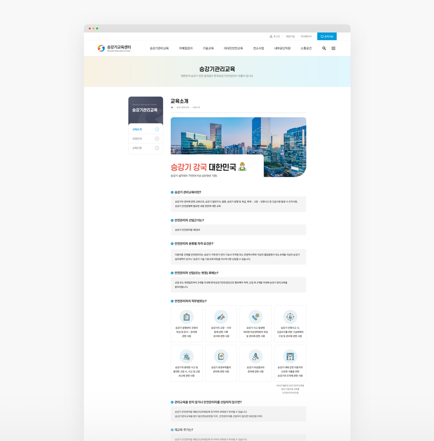 승강기교육센터는 승강기 안전교육을 통하여 국민 모두가 안전하고 믿고 탈수 있는 승강기 안전을 책임지고 있습니다. 홈페이지의 방대한 정보를 중요도에 따라 분류하여 정보 전달이 용이하도록 디자인되었고, 홈페이지 이용자가 디바이스의 제약없이 편리하게 이용할 수 있도록 설계되었습니다.