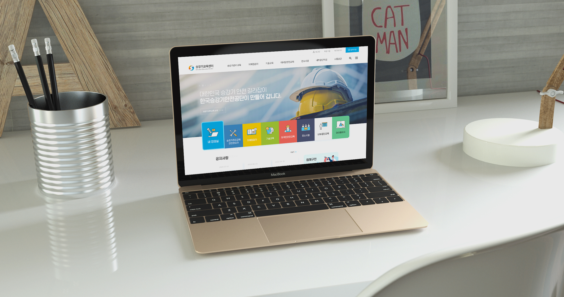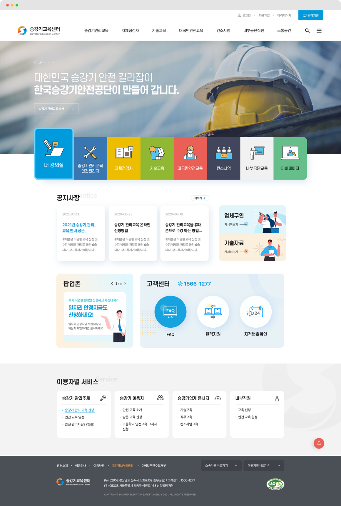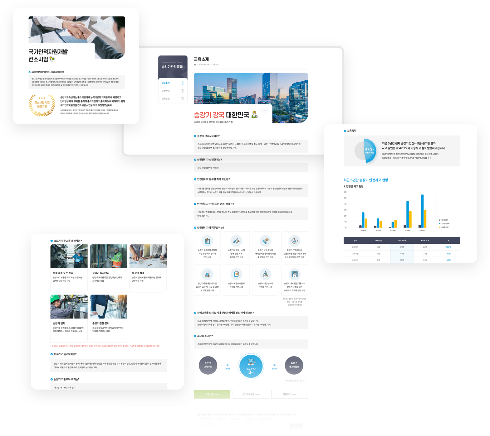승강기교육센터는 승강기 안전교육을 통하여 국민 모두가 안전하고 믿고 탈수 있는 승강기 안전을 책임지고 있습니다. 홈페이지의 방대한 정보를 중요도에 따라 분류하여 정보 전달이 용이하도록 디자인되었고, 홈페이지 이용자가 디바이스의 제약없이 편리하게 이용할 수 있도록 설계되었습니다.