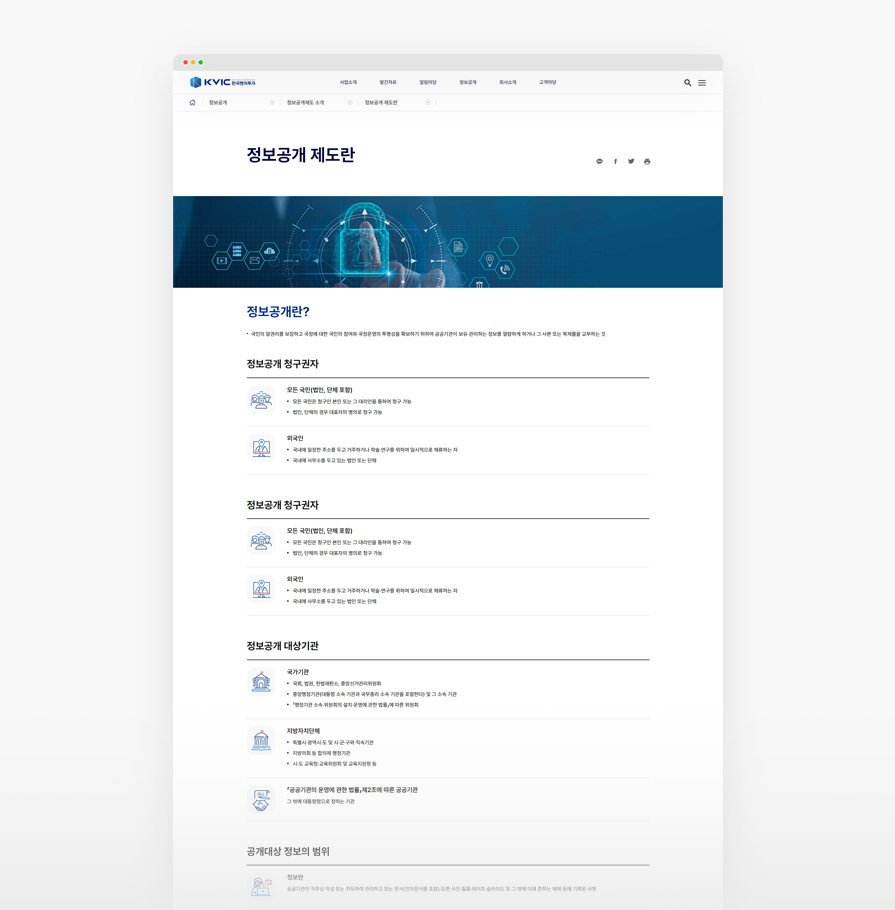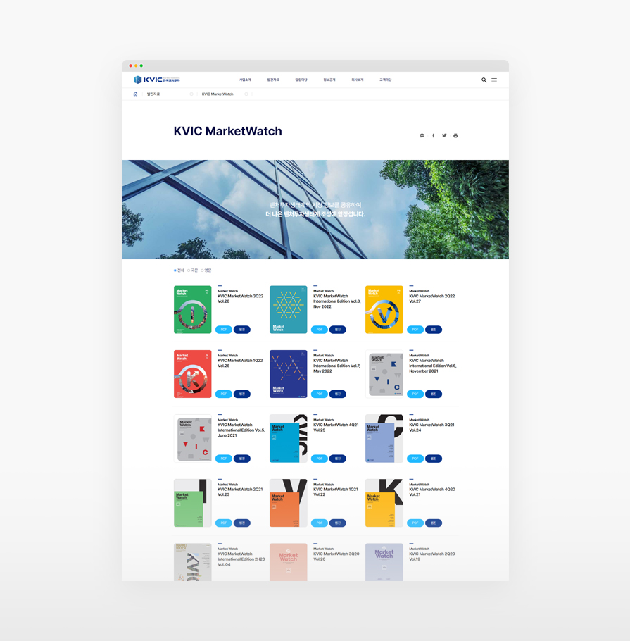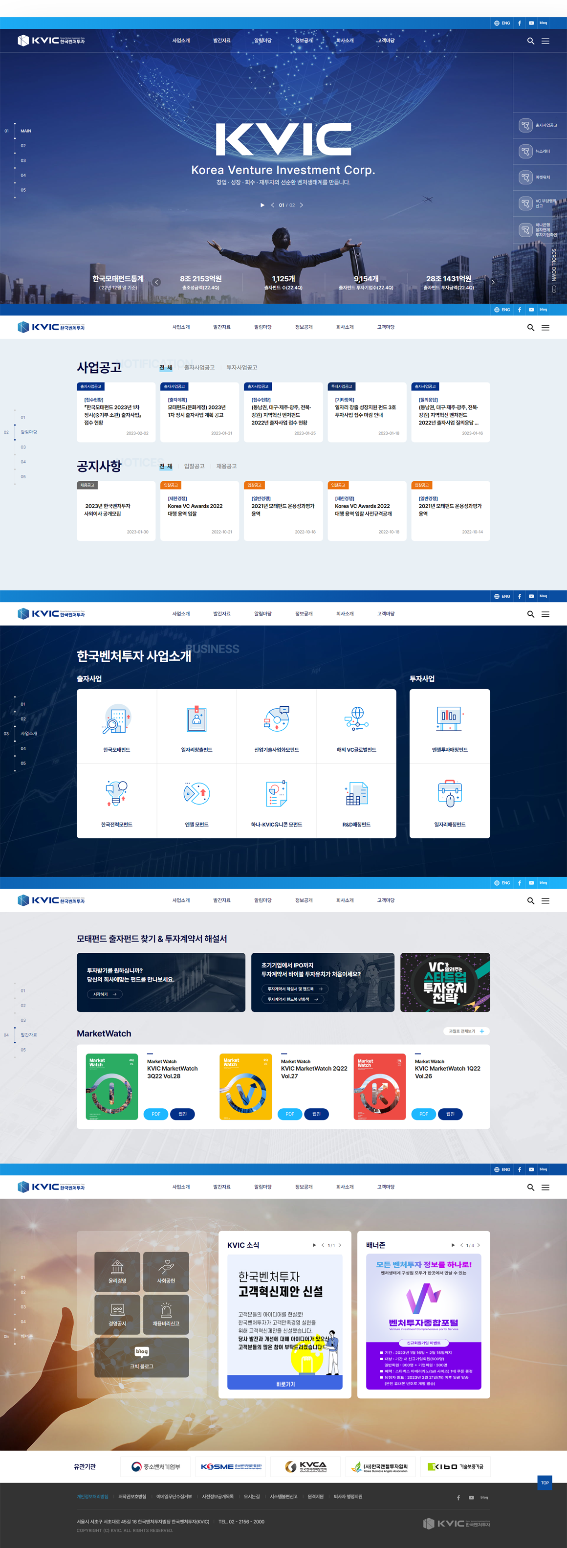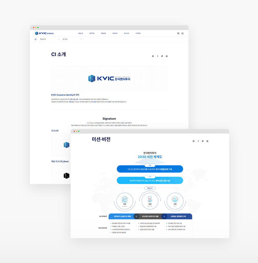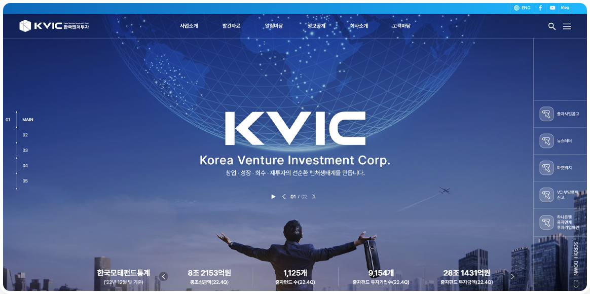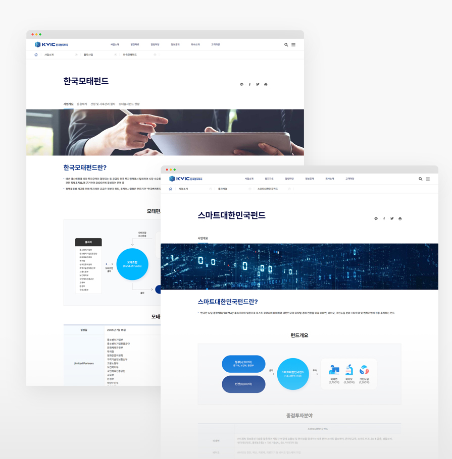 한국벤처투자는 글로벌 모태펀드 운용 전문기관입니다. 사이트 이용자에게 높은 신뢰도를 주기 위하여 깔끔하고 세련된 UI와 차분한 색감을 사용하였습니다. 또한 픽토그램의 적극적 사용과 사이트맵을 한눈에 볼 수 있는 GNB를 통해, 복잡하고 많은 양의 정보를 보다 쉽게 전달할 수 있도록 노력을 기울였습니다.